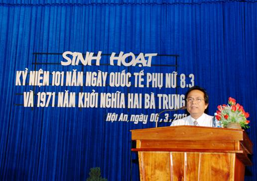 Thay mặt lãnh đạo Trường PTDTNT tỉnh Quảng Nam, đơn vị có Công đoàn đăng cai tổ chức buổi sinh hoạt, Đồng chí Trần Minh Hiệu, Bí thư Đảng bộ, Hiệu trưởng, Trưởng ban vì sự tiến bộ Phụ nữ nhà trường đã phát biểu chào mừng và tặng hoa cho đại diện nữ công ngành Giáo dục nhân ngày 8/3.