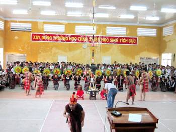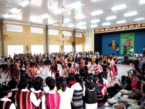 Tiếp theo, các em học sinh đã tái hiện lễ cúng mừng lúa mới và tham gia múa cồng chiêng cùng các điệu dân vũ của đồng bào dân tộc thiểu số tỉnh Quảng Nam. Lễ cúng mừng lúa mới được xây dựng theo phong tục của người Cơtu. Không khí tưng bừng, nhộn nhịp tràn đầy tình thân ái khi các em học sinh mời đại biểu và cán bộ viên chức nhà trường cùng tham gia múa cộng đồng quanh cây nêu.