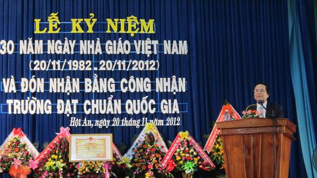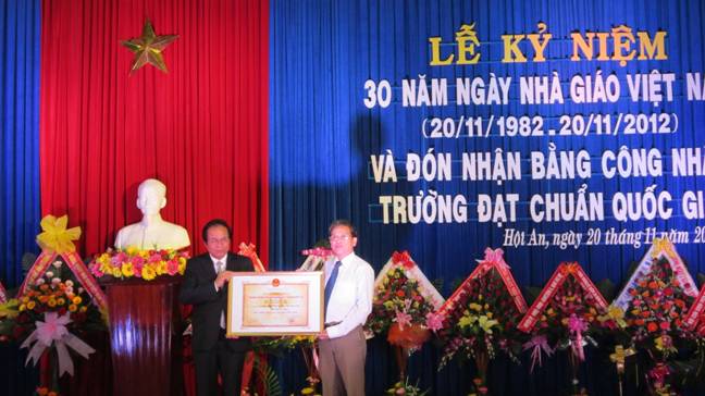 Đến dự và phát biểu tại buổi lễ, Giám đốc Sở Giáo dục và Đào tạo tỉnh Quảng Nam đã ghi nhận và đánh giá cao những kết quả mà thầy và trò nhà trường đã đạt được trong những năm qua và trong năm học 2011-2012; động viên và chỉ đạo thầy và trò nhà trường tiếp tục phấn đấu, nâng cao hơn nữa chất lượng giáo dục, xứng đáng với danh hiệu trường THPT đầu tiên của tỉnh đạt chuẩn quốc gia. Tại buổi lễ, thừa ủy nhiệm của UBND tỉnh Quảng Nam, Giám đốc Sở Giáo dục và Đào tạo tỉnh đã trao Bằng công nhận trường đạt chuẩn quốc gia cho nhà trường.