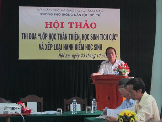 Phát biểu khai mạc Hội thảo, Thầy Trần Minh Hiệu, Hiệu trưởng nhà trường đánh giá cao hiệu quả, tác dụng và sự cần thiết của việc chấm điểm, xếp loại thi đua và đánh giá, xếp loại hạnh kiểm học sinh mà nhà trường đã triển khai trong thời gian qua. Trên cơ sở Chỉ thị 40/2008/CT-BGDĐT ngày 22/7/2008 của Bộ trưởng Bộ GD&ĐT, Thông tư 58/2011/TT-BGDĐT ngày 21/12/2011 của Bộ GD&ĐT về Quy chế đánh giá, xếp loại hạnh kiểm học sinh, các văn bản hướng dẫn của Ngành, Trường PTDTNT tỉnh Quảng Nam đã vận dụng, cụ thể hóa sáng tạo xây dựng bộ Quy định về chấm điểm, xếp loại phong trào thi đua “Lớp học thân thiện, học sinh tích cực” và đánh giá, xếp loại hạnh kiểm học sinh. Để triển khai thực hiện có hiệu quả các nội dung trên, Lãnh đạo Trường đã chỉ đạo chặt chẽ, tổ chức dự thảo, lấy ý kiến triển khai thí điểm và thực hiện đại trà từ năm học 2011-2012 đến nay.