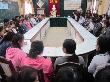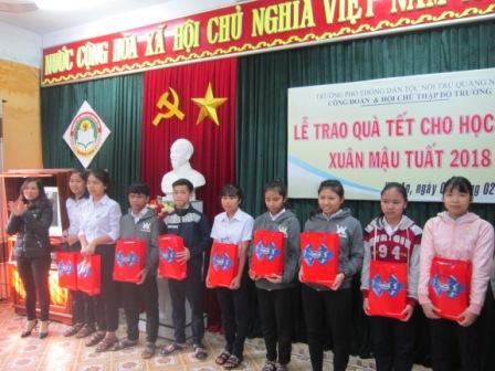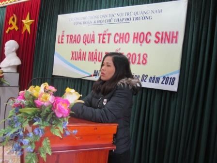 Phát biểu tại buổi Lễ, cô Trần Thị Ngọc Trường đã biểu dương, ghi nhận sự cố gắng và những thành tích đã đạt được của các em học sinh. Mong muốn trong thời gian tới, mỗi bạn cần nỗ lực vượt lên trên hoàn cảnh khó khăn để học tập trở thành những người giúp ích cho gia đình và xã hội. Nhân dịp xuân mới, đồng chí Chủ tịch Hội chữ thập đỏ cũng chúc các em cùng gia đình một năm mới sức khỏe, an khang, hạnh phúc. Đồng thời, tiến hành trao tặng 75 xuất quà cho các em học sinh có hoàn cảnh gia đình khó khăn, vươn lên trong học tập, đạt kết quả cao trong học kỳ I, năm học 2017-2018.