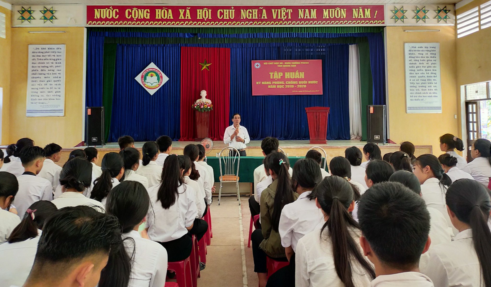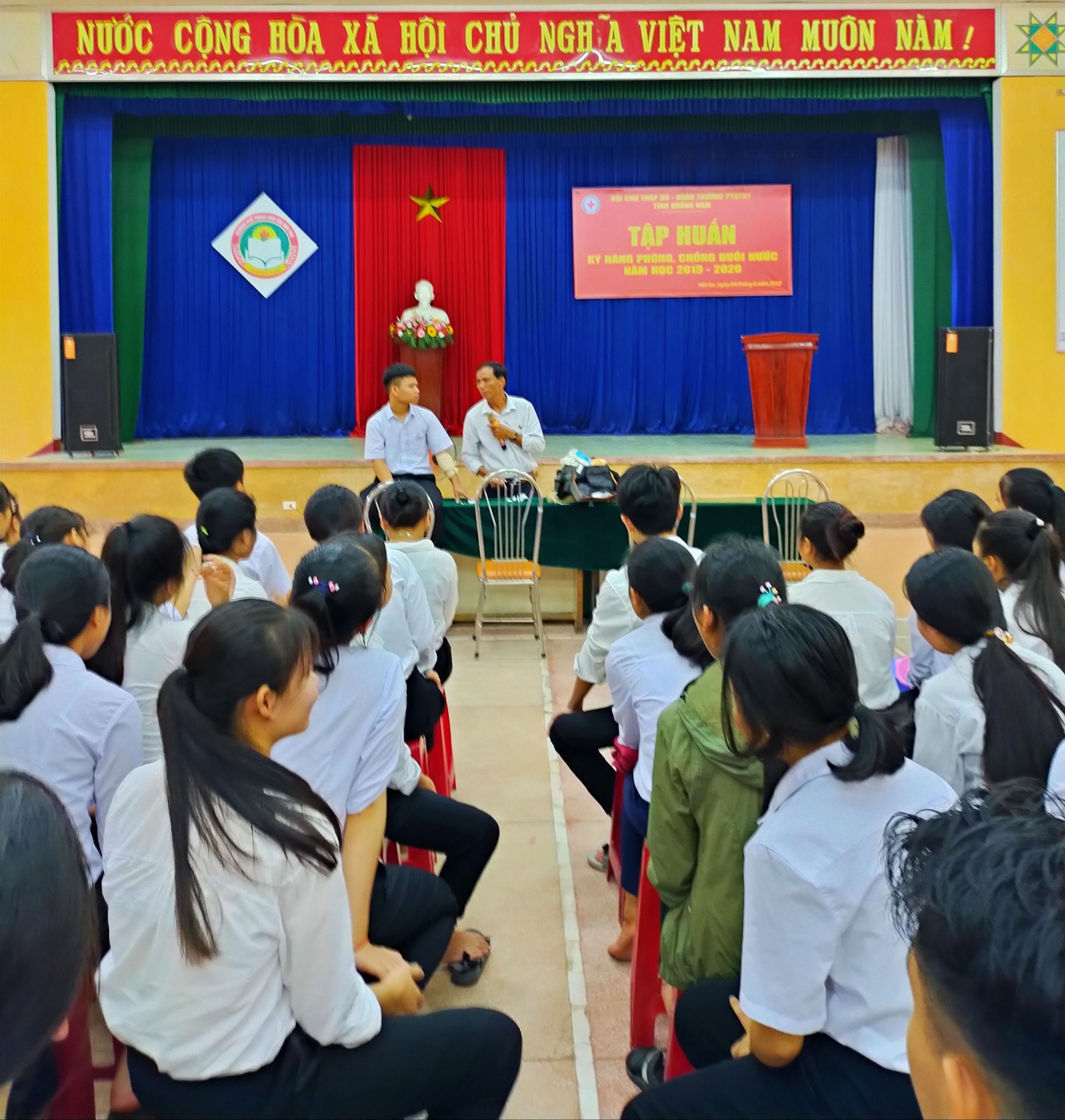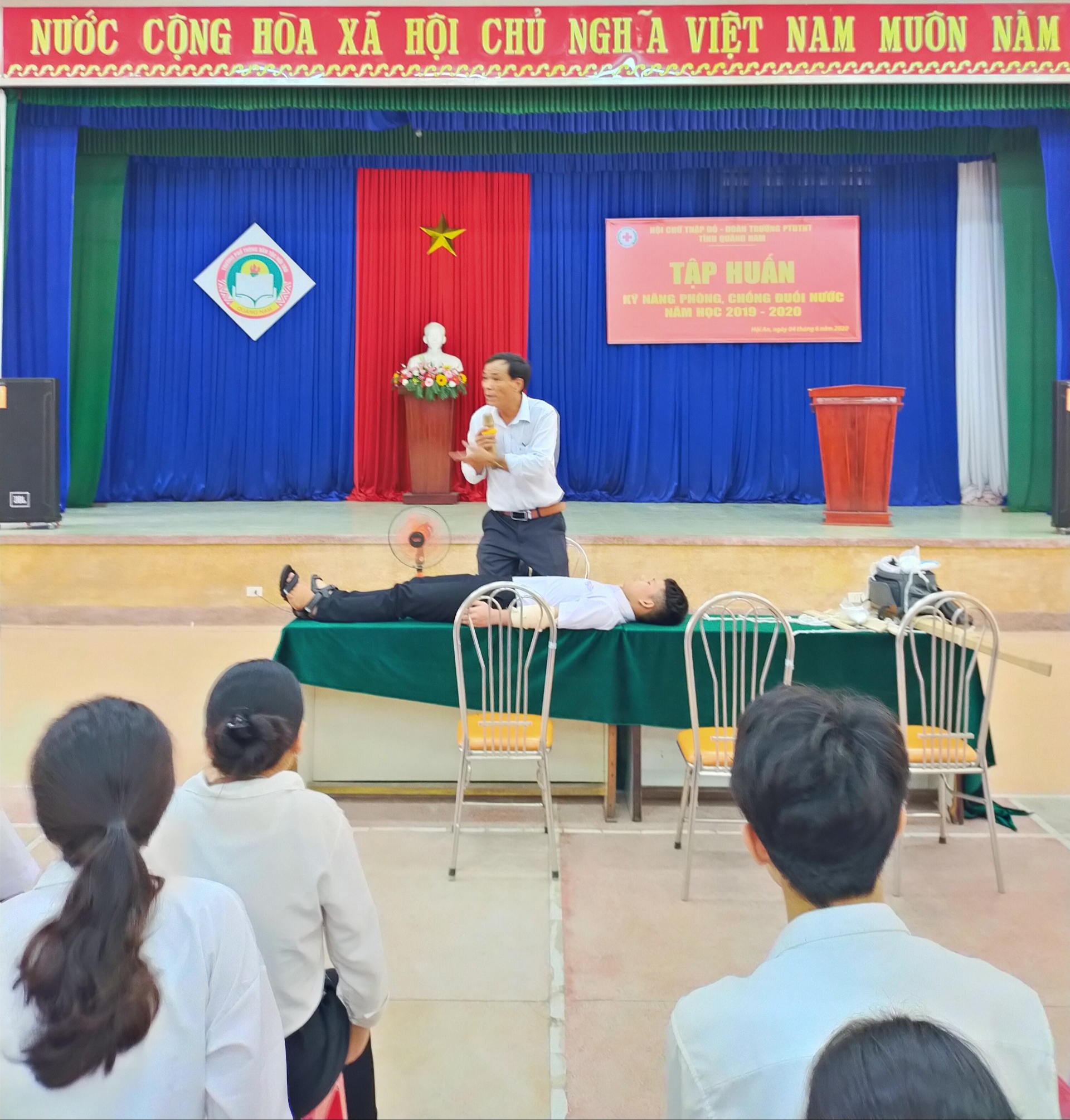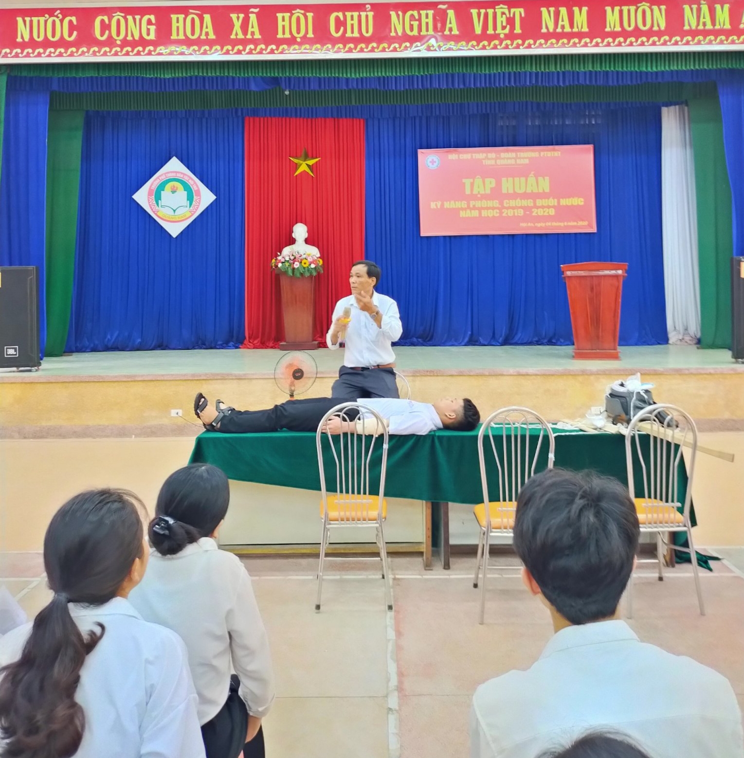 Thực hiện Nghị quyết nhiệm vụ công tác Hội năm học 2019-2020, chiều ngày 04/6/2020, Hội Chữ thập đỏ cùng với Đoàn thanh niên trường PTDTNT tỉnh Quảng Nam phối hợp với Hội Chữ thập đỏ thành phố Hội An, Trung tâm Y tế thành phố Hội An tổ chức tập huấn phòng, chống đuối nước và sơ cấp cứu ban đầu cho 150 Hội viên Hội CTĐ trong nhà trường.