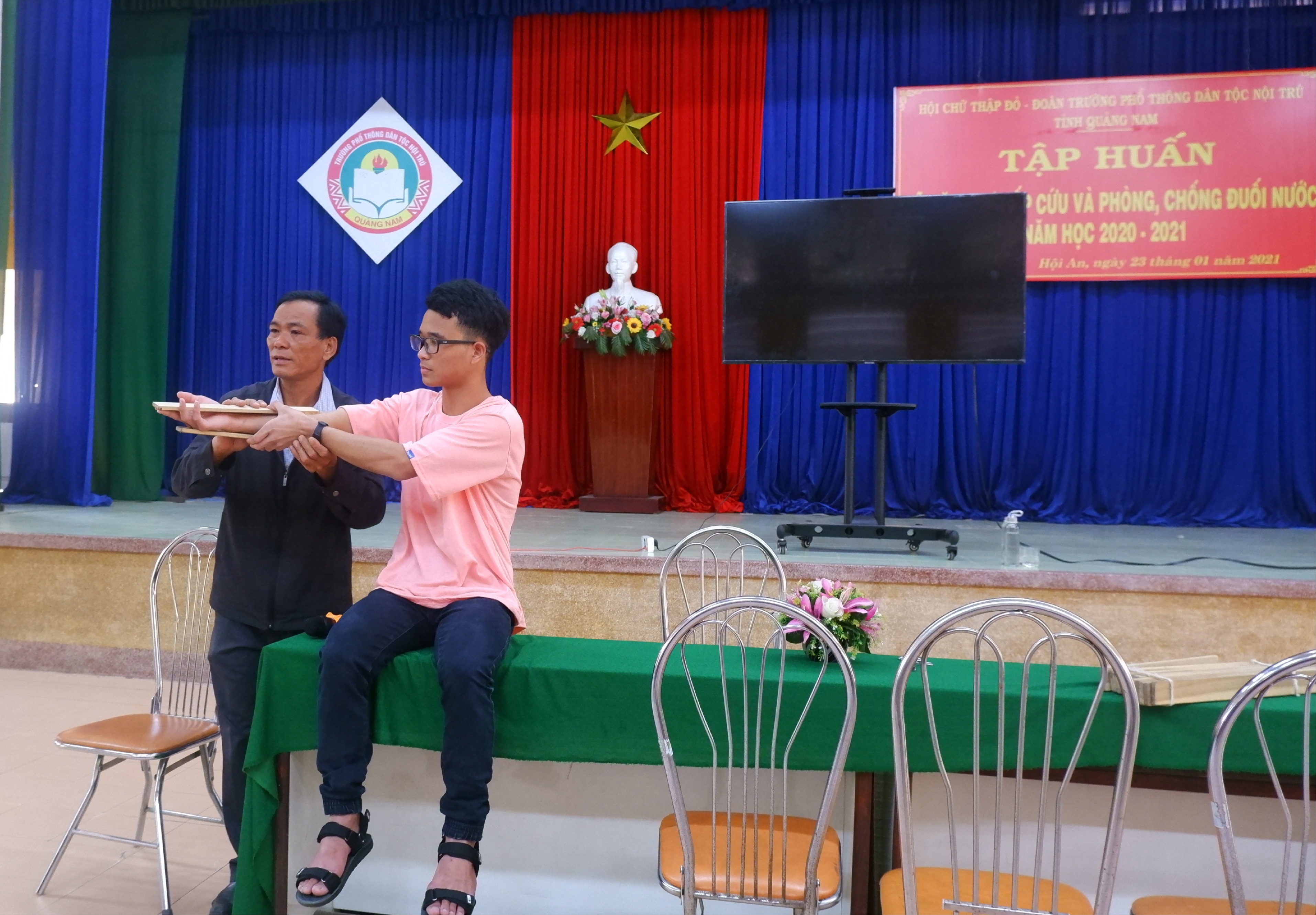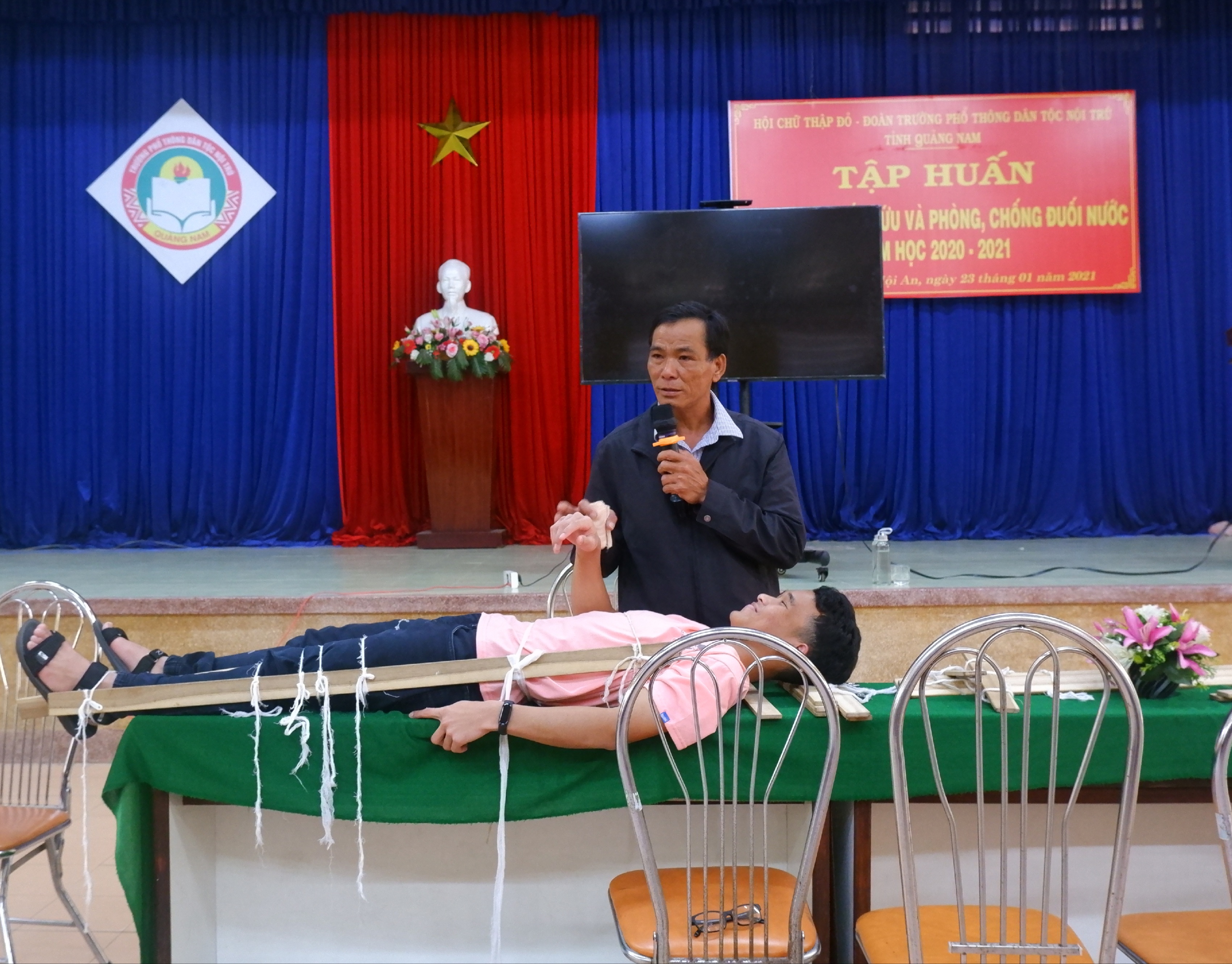 Chiều ngày 23/01/2021, Đoàn TN - Hội CTĐ trường PTDTNT tỉnh Quảng Nam phối hợp với Hội CTĐ thành phố Hội An và Trung tâm Ytế thành phố Hội An tổ chức tập huấn kỹ năng phòng, chống đuối nước và sơ cấp cứu ban đầu cho 457 Hội viên Hội CTĐ trong nhà trường. Tại buổi tập huấn, các em Hội viên CTĐ đỏ được đồng chí Hứa Đại Cúc, Trung tâm Ytế thành phố Hội An và một số đồng chí trong Hội CTĐ thành phố Hội An truyền đạt một số kiến thức liên quan đến công tác Hội; tập huấn kỹ năng, kỹ thuật sơ cấp cứu; biện pháp và cách xử lý một số tình huống về phòng, chống tai nạn đuối nước và các tai nạn thương tích khác trong cuộc sống hằng ngày.