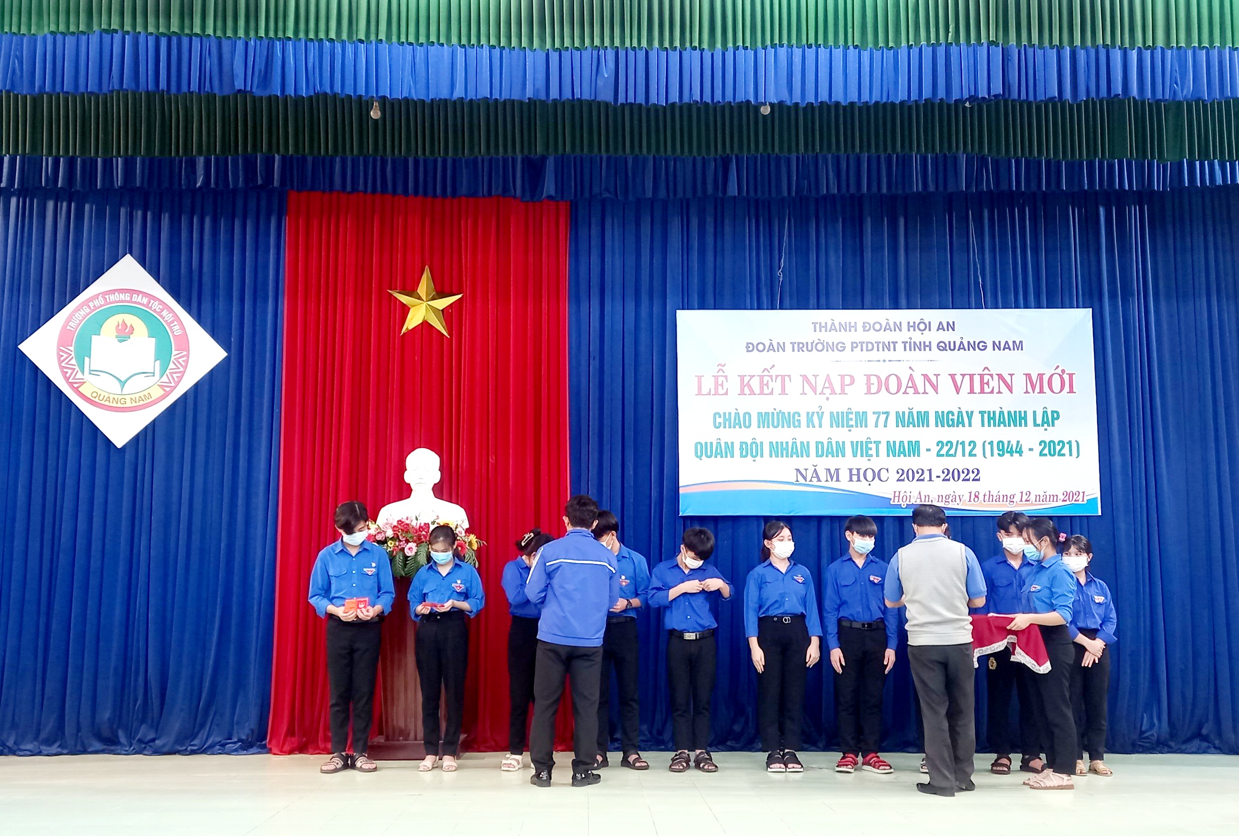 Chiều ngày 18/12/2021, Đoàn trường PTDTNT tỉnh Quảng Nam tổ chức Lễ kết nạp Đoàn viên mới tại nhà Đa Năng nhân kỷ niệm 77 năm ngày thành lập Quân đội nhân dân Việt Nam (22/12/1944-22/12/2021). Tại buổi Lễ, đồng chí Tưởng Thanh Hùng, Đảng ủy viên, Bí thư Đoàn trường ôn lại truyền thống 77 năm cống hiến và trưởng thành của Quân đội nhân dân Việt Nam, qua đó nhắc nhỡ đoàn viên được kết nạp vào đoàn lần này cố gắng tu dưỡng học tập và rèn luyện, nâng cao tinh thần cảnh giác, ý thức bảo vệ Tổ quốc, tham gia xung kích, đi đầu trong mọi lĩnh vực để xứng đáng với niềm tin yêu của Bác Hồ. Đồng chí Tưởng Thanh Hùng đã trao thẻ Đoàn viên và huy hiệu Đoàn cho 100 thanh niên ưu tú tiêu biểu kết nạp vào đoàn lần này. Một số hình ảnh tại buổi lễ