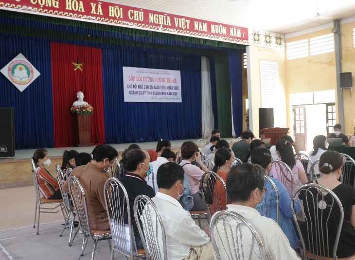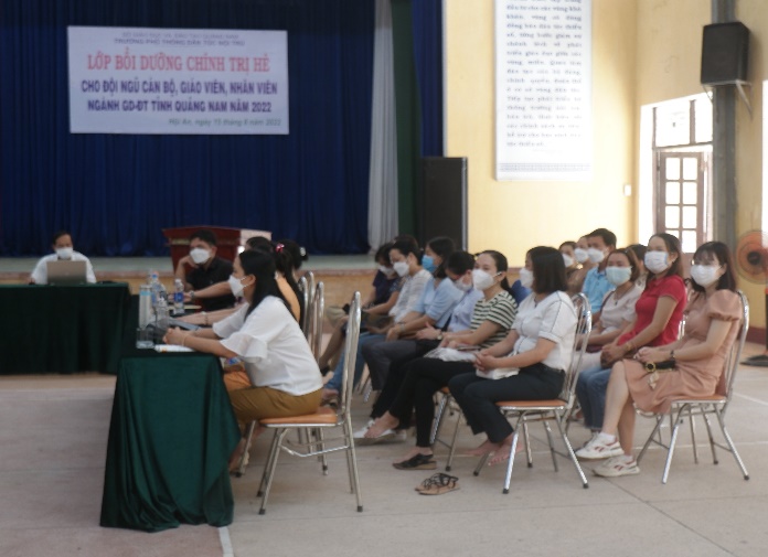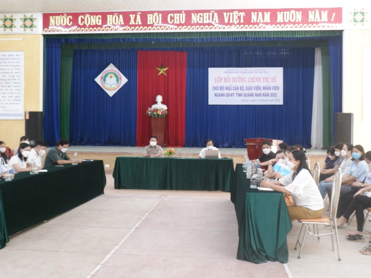 Thực hiện kế hoạch số 82 – KH/BTGTU ngày 28/07/2022 của Ban Tuyên giáo Tỉnh ủy Quảng Nam về bồi dưỡng chính trị hè năm 2022 cho đội ngũ cán bộ, giáo viên, nhân viên ngành giáo dục và đào tạo tỉnh Quảng Nam, ngày 15/08/2022, đội ngũ cán bộ, giáo viên, nhân viên của trường PTDTNT tỉnh đã tích cực tham gia bồi dưỡng chính trị hè năm 2022. Trong đợt bồi dưỡng chính trị hè năm 2022 này, đội ngũ cán bộ, giáo viên, nhân viên của trường PTDTNT tỉnh đã được nghe báo cáo 4 chuyên đề bồi dưỡng (trong đó có 3 chuyên đề của Ban Tuyên giáo tỉnh ủy và 1 chuyên đề của Sở GD và ĐT Quảng Nam), lần lượt là: