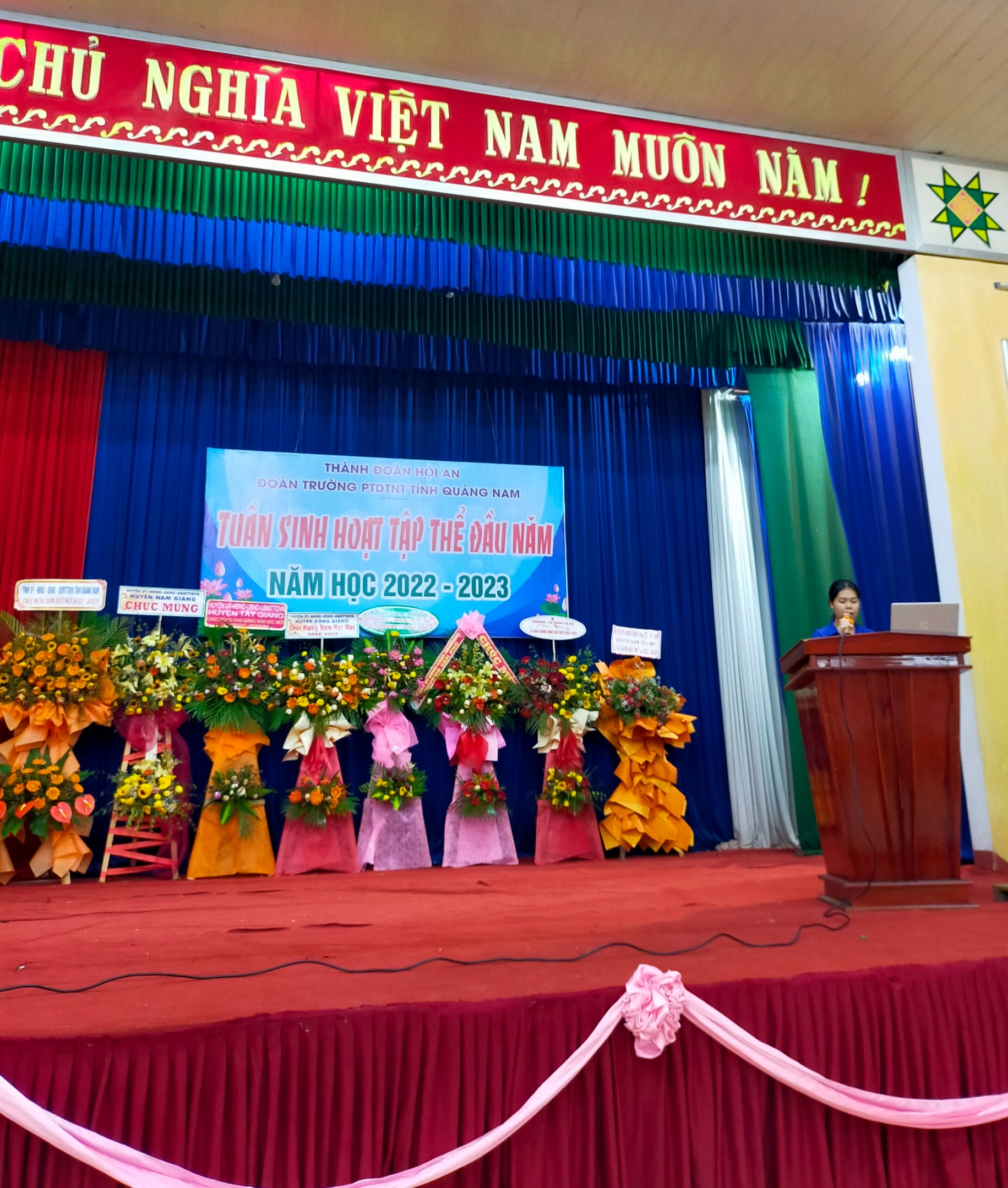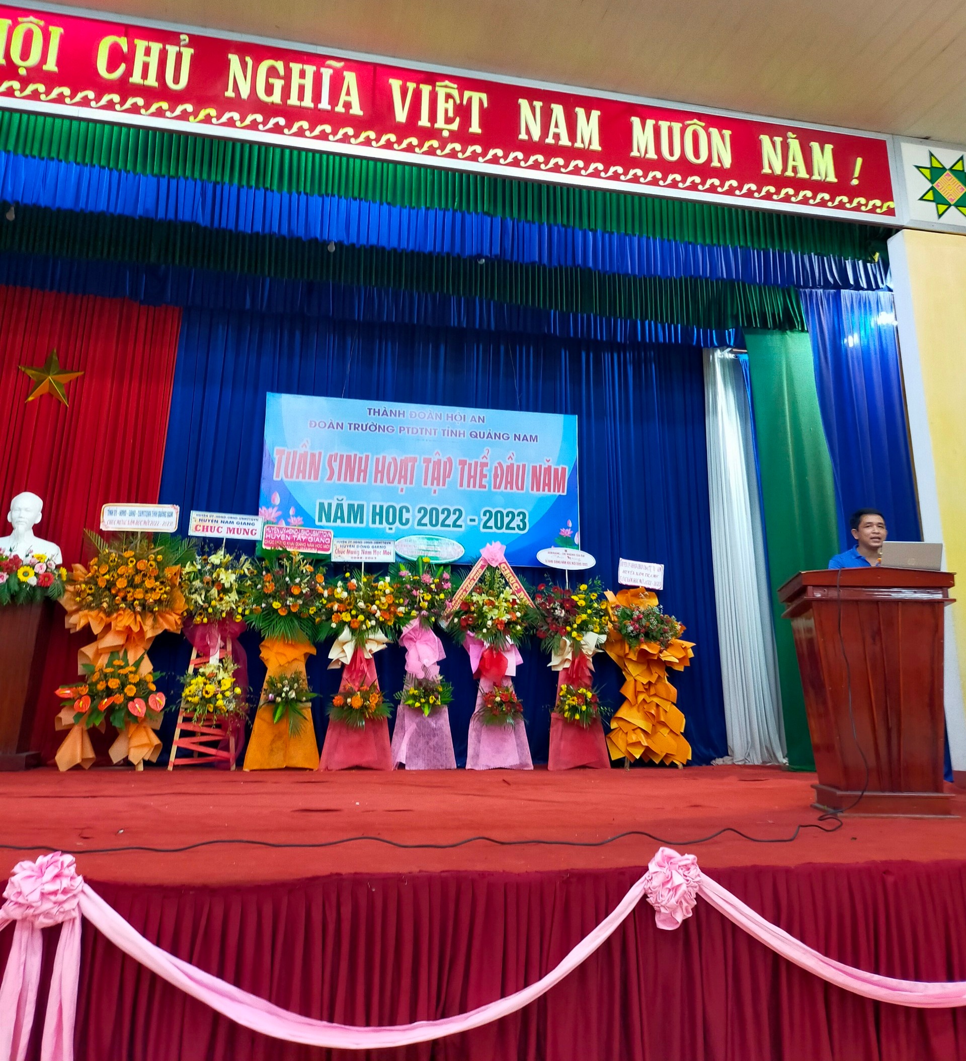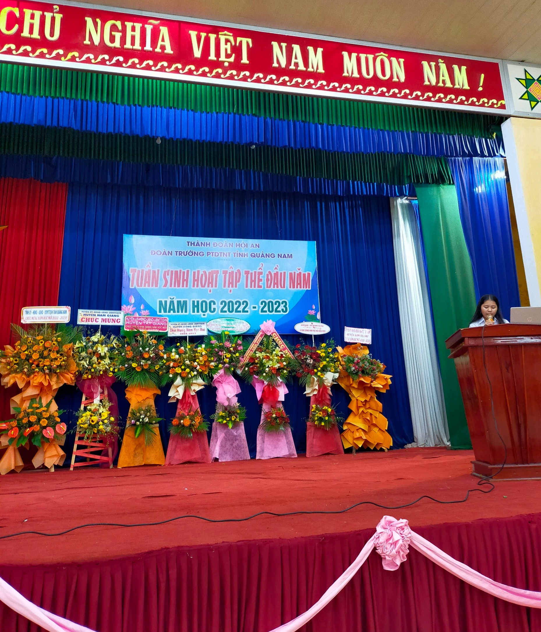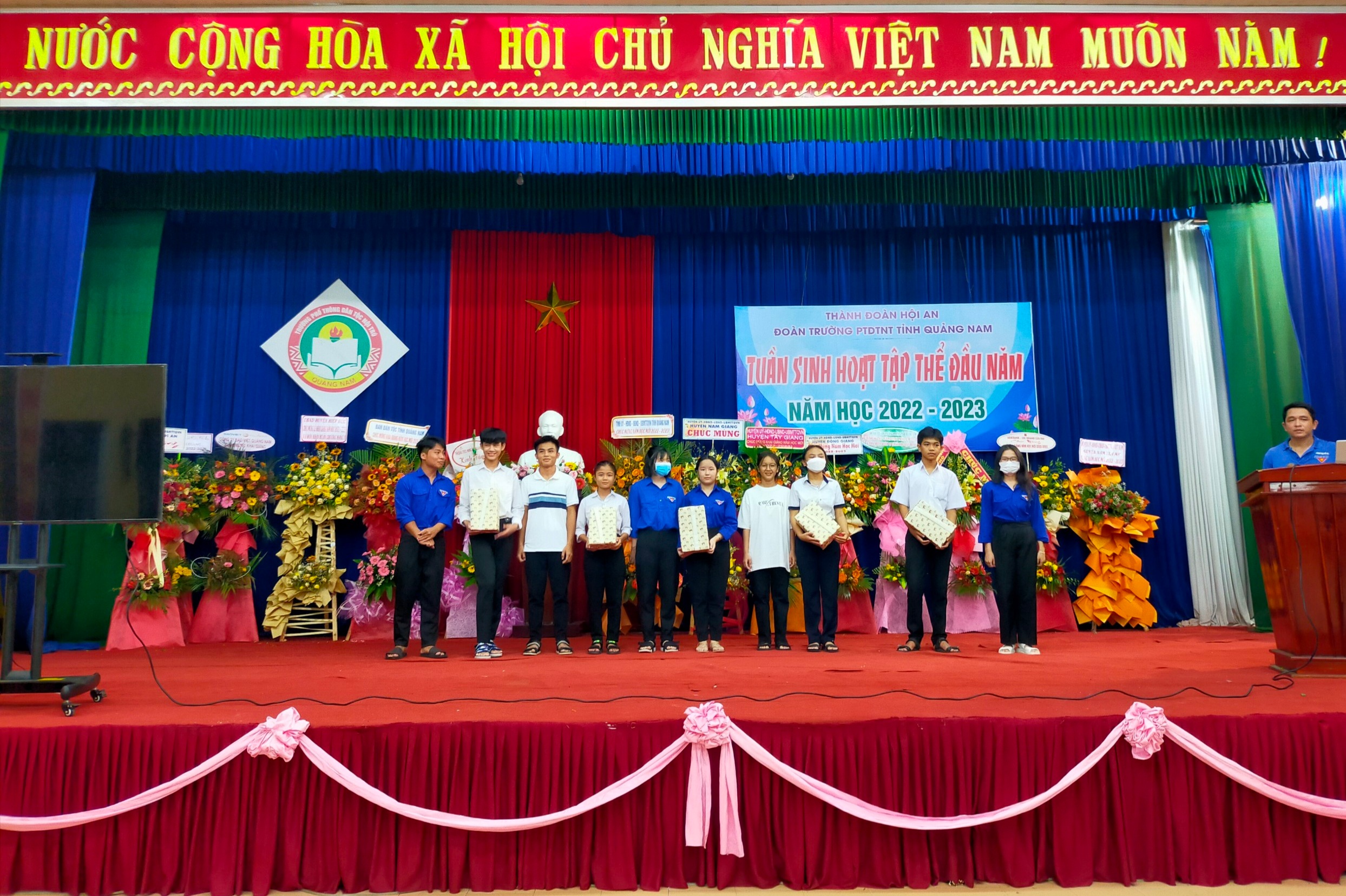 - Tiếp theo là phát biểu của đại diện học sinh lớp 10 mới tuyển, cảm ơn về tình cảm của các anh chị HS lớp 11, 12 dành cho HS mới tuyển. Cùng ở hoạt động này, các lớp đã hăng hái, mạnh dạn chuẩn bị các tiết mục văn nghệ để chương trình thêm nhiều màu sắc, qua đó gắn kết các em học sinh thuộc các khối trong nhà trường nhiều hơn. - Song song với hoạt động giao lưu giữa các học sinh. Nhà trường cũng tổ chức cuộc thi tìm hiểu về cơ cấu tổ chức, bộ máy, các hoạt động giáo dục trong nhà trường; giới thiệu về truyền thống nhà trường. Các em HS đã tham gia hoạt động này với tinh thần sôi nổi, tích cực. Đây là hoạt động vô cùng ý nghĩa để bồi đắp niềm tin yêu, tự hào của các em HS đối với ngôi trường PTDTNT tỉnh Quảng Nam.